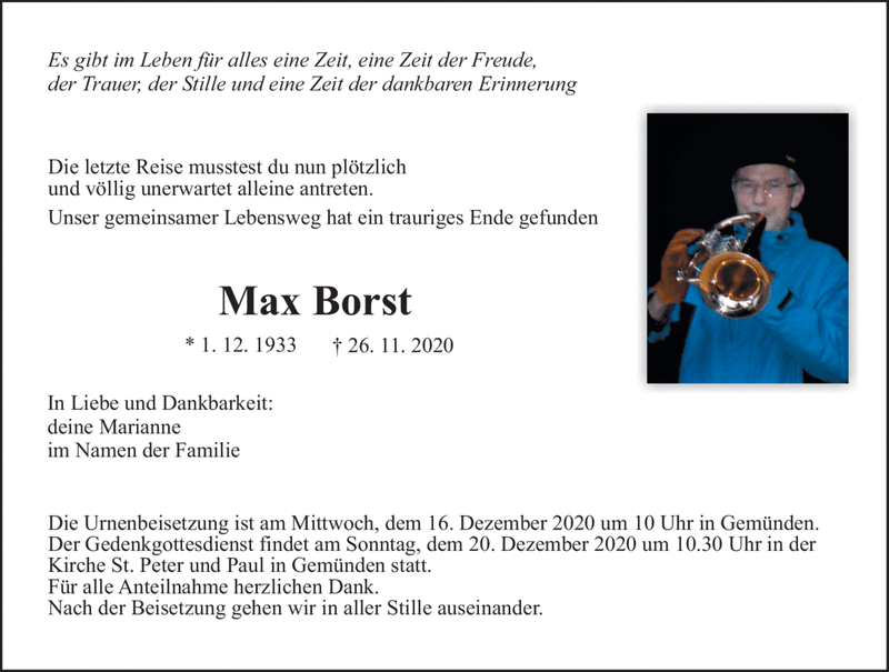 Lieber Max, wir haben jahrelang fröhlich zusammen musiziert. Wir denken gerne an die gemeinsame Zeit zurück. Wir werden Dich vermissen.