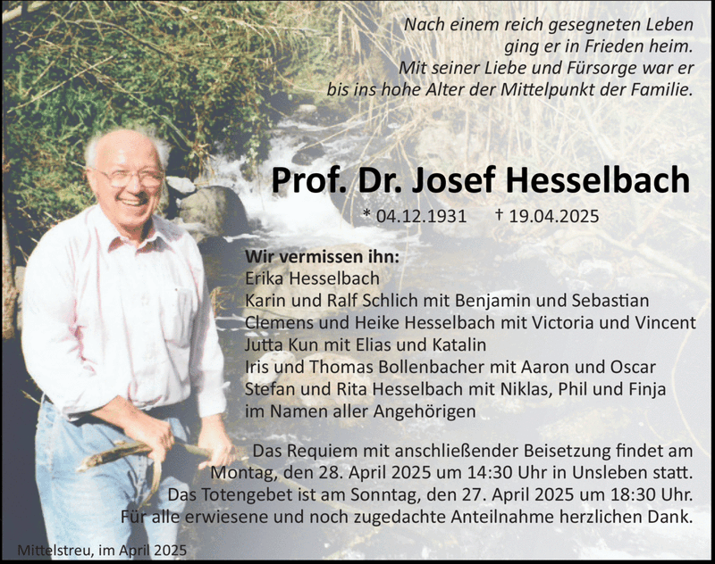 Wir wünschen herzliches Beileid Erika Hesselbach und allen Angehörigen. Wieder ein Guter Mensch der gegangen ist gern in und mit der Natur gelebt. ,, Herr Prof.Dr. Josef Hesselbach " Der Tod ist die Grenze des Lebens, nicht aber die Liebe " Die aber am Ziel sind , haben den Frieden.